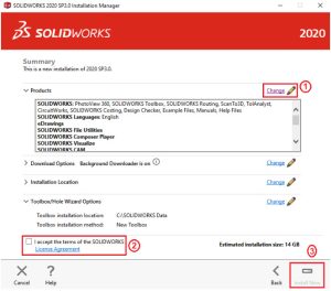 Sau đó tick chọn ô I accept the terms of the SOLIDWORKS (2) và nhấn Install Now (3). Nhấn OK.